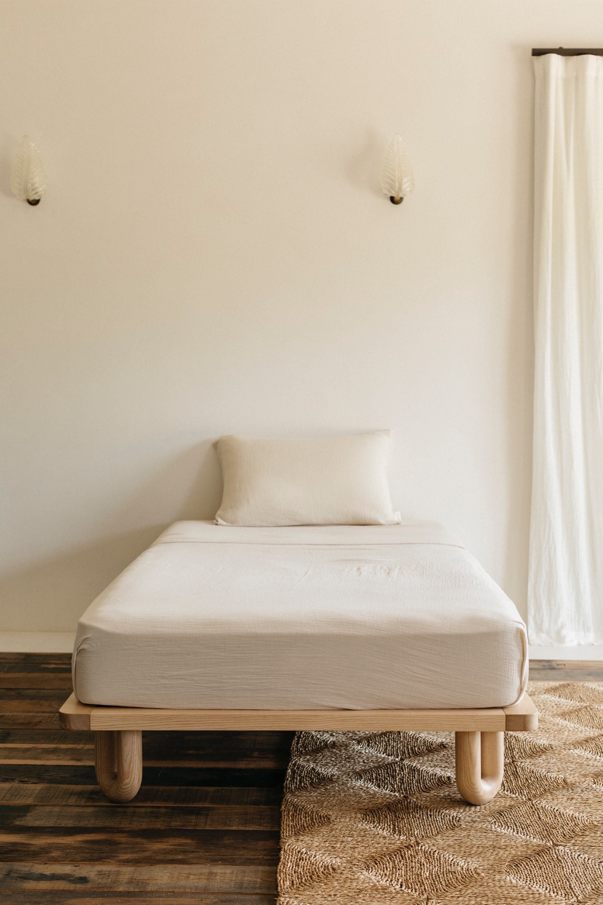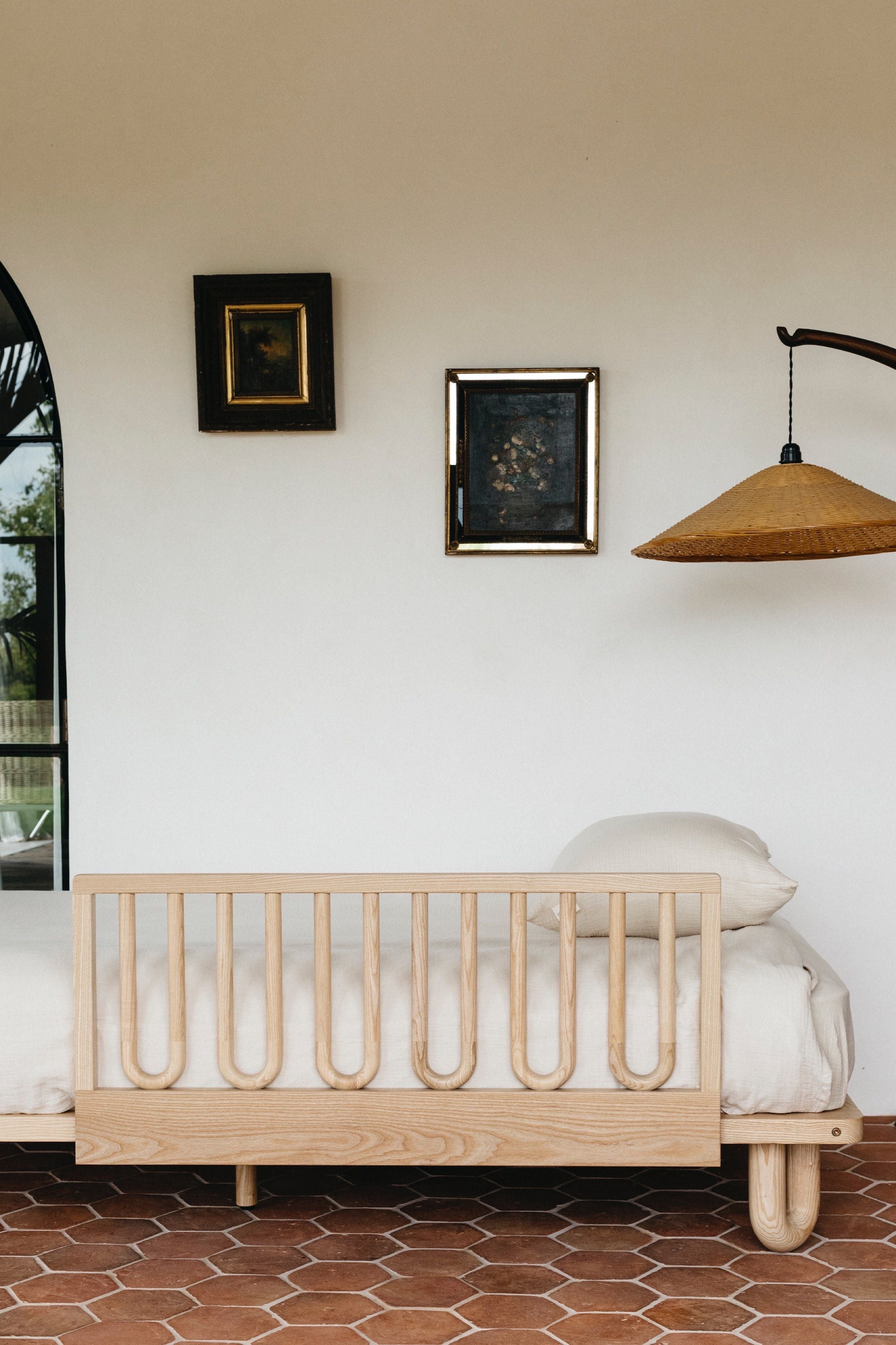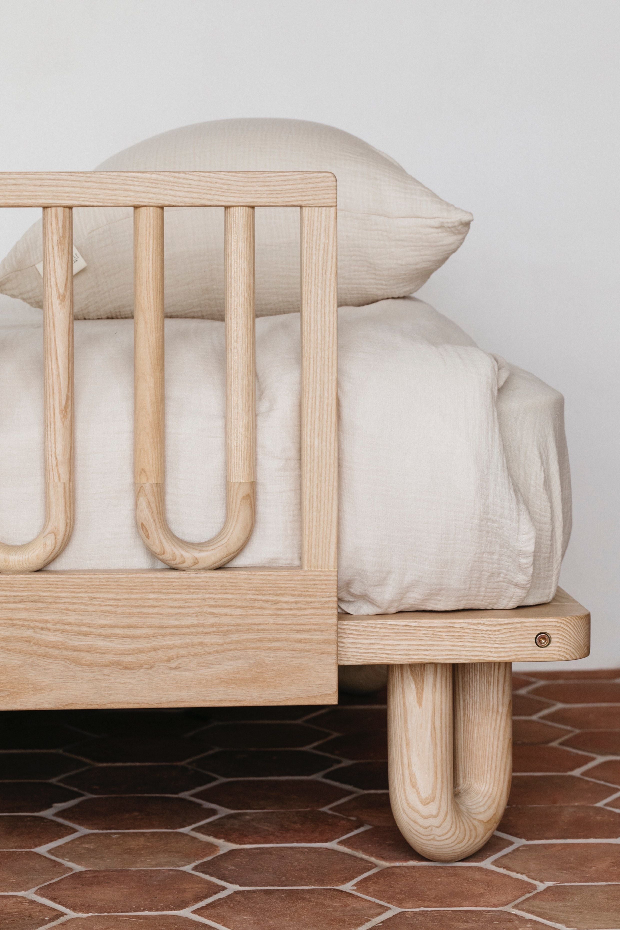 The Arche king single bed is designed to transition your growing child seamlessly from cot to bed, providing comfort and security. Crafted from solid ashwood, it showcases elegant curved edges and natural grain patterns, blending style with durability. Compatible with all Sacred Bundle toddler side rails, this bed offers peace of mind with an open, modern design. A perfect combination of form and function, the Arche king single bed is a stylish and practical addition to your child's evolving space.