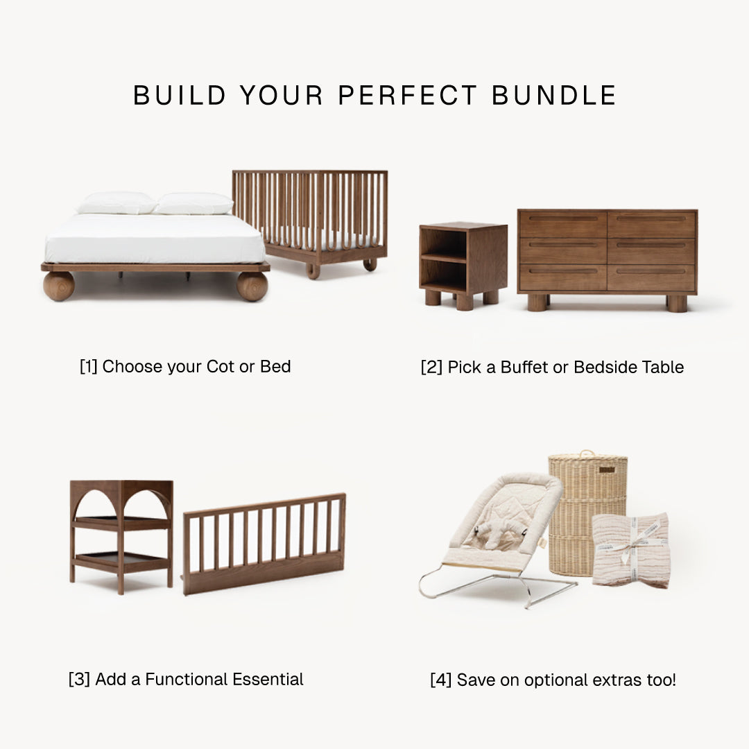 Simply choose from the categories below and bring your dream space to life. We have designed our bundle builder to allow you to choose a combination of pieces that blend seamlessly and give you a complete premium nursery package.