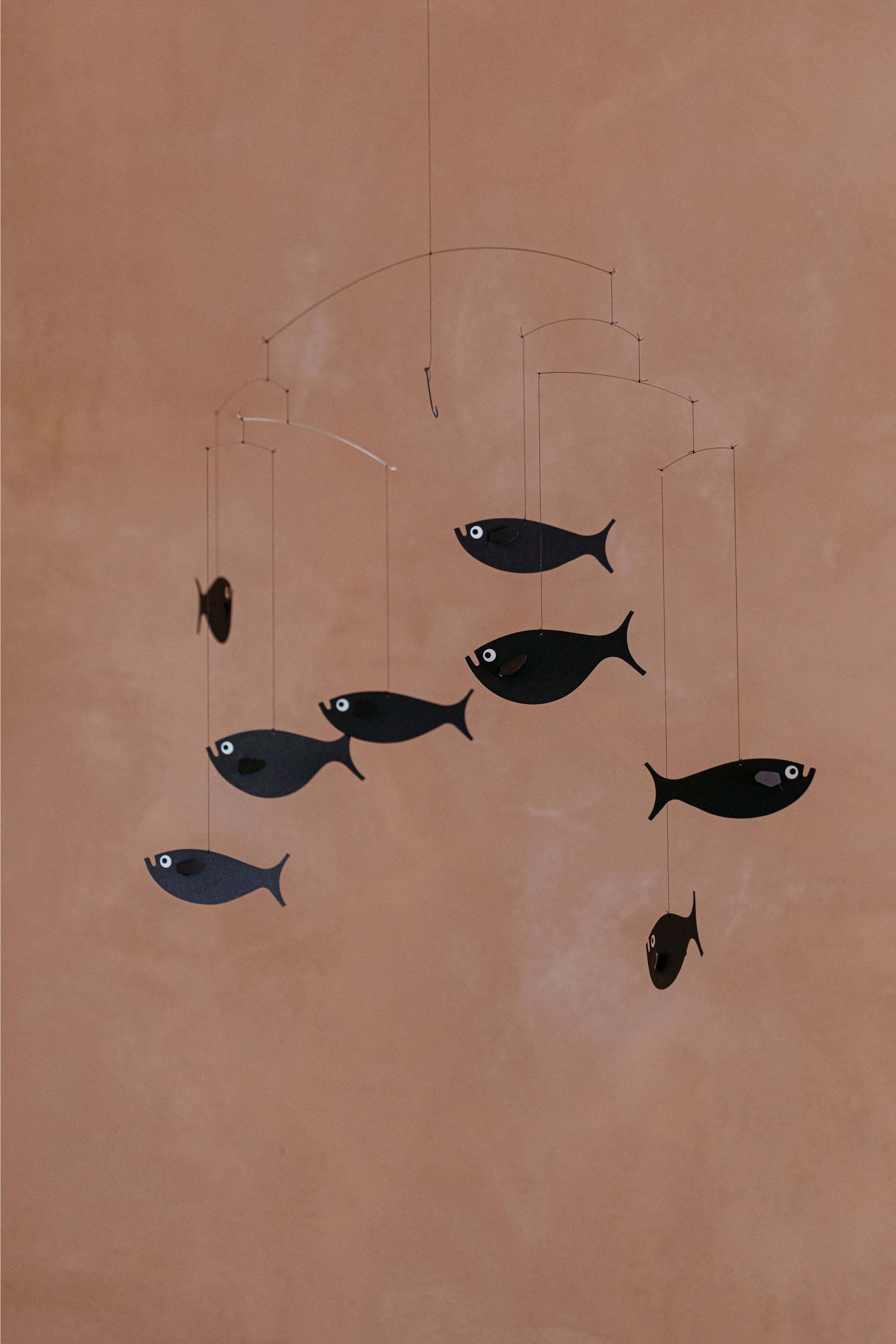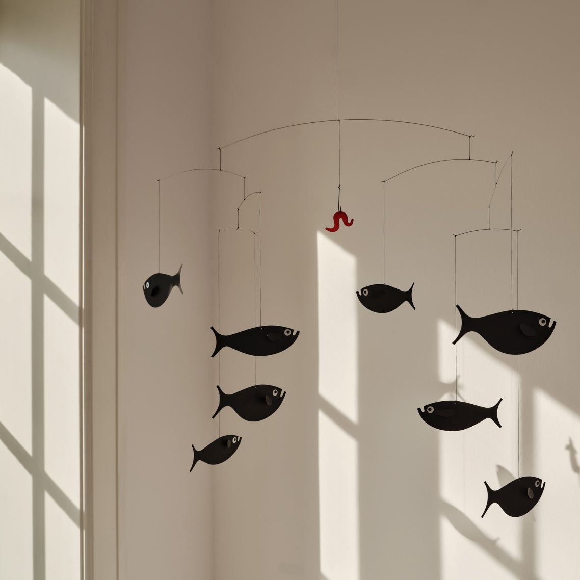 Shoal of Fish is a playful piece where eight fish chase a tempting worm, bringing life to any room with their lively swimming. Designed in Denmark by Christian Flensted in 1965, this piece is perfect for adding a fun hanging element to your child’s bedroom or nursery.