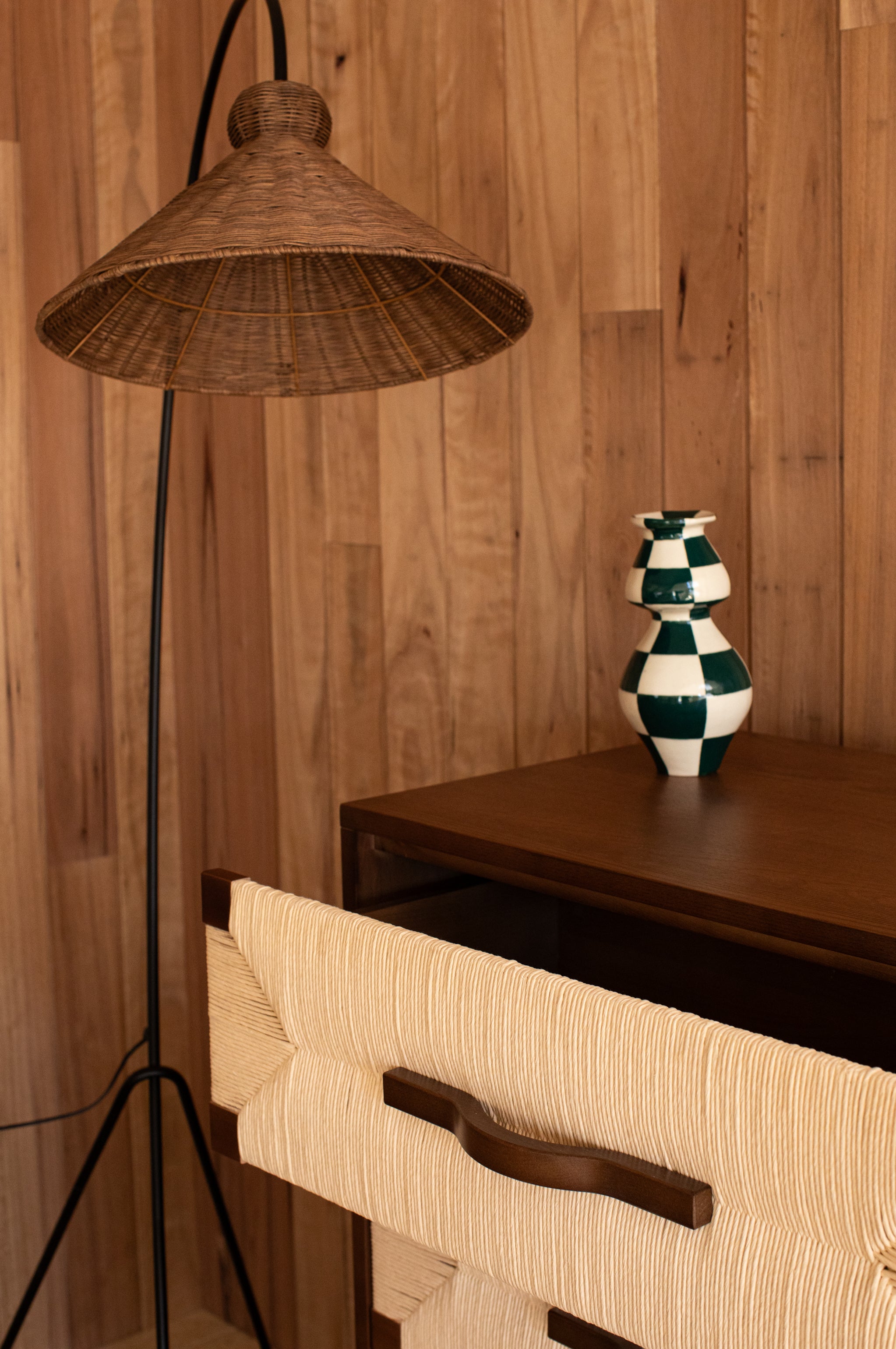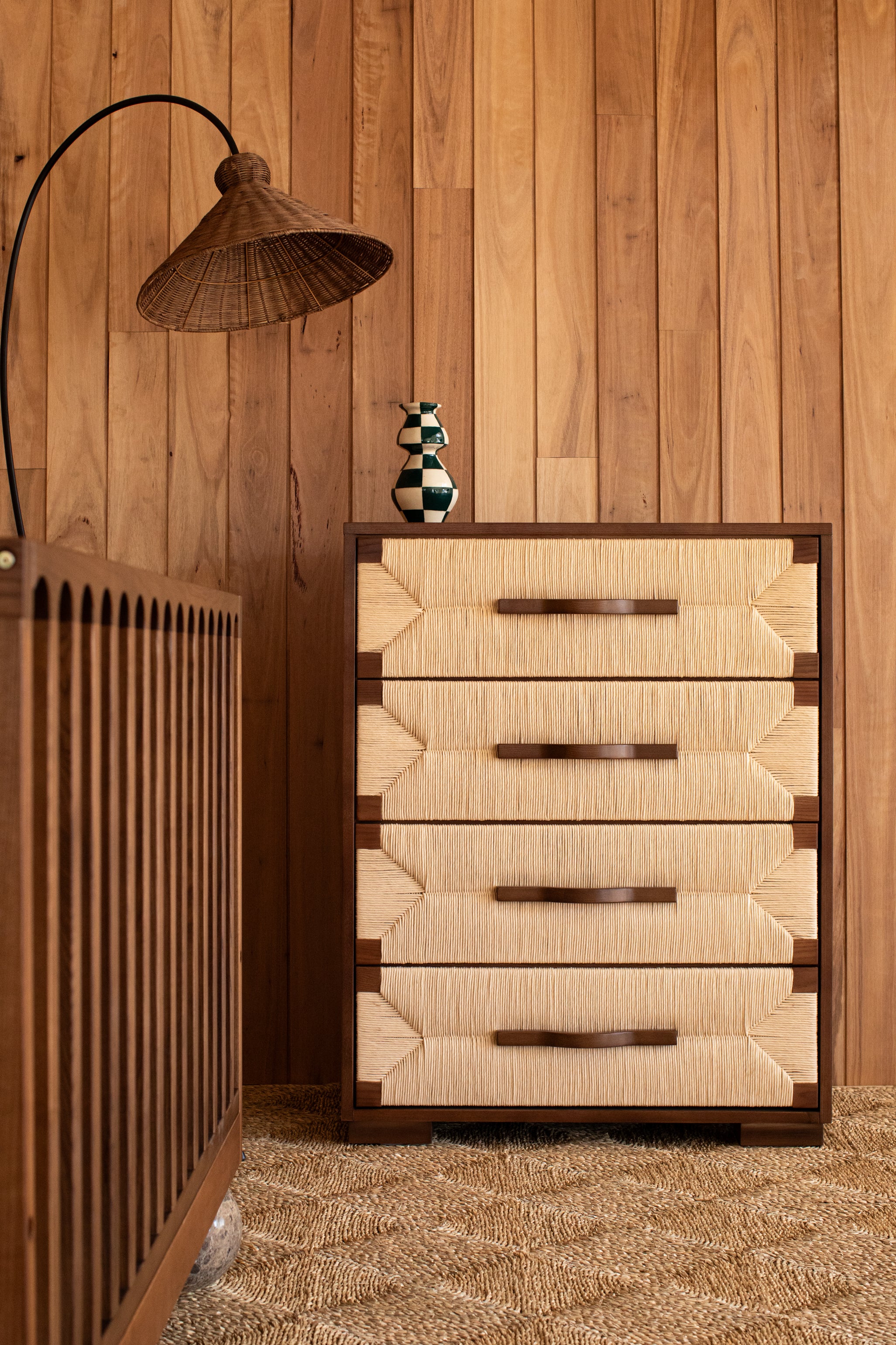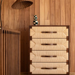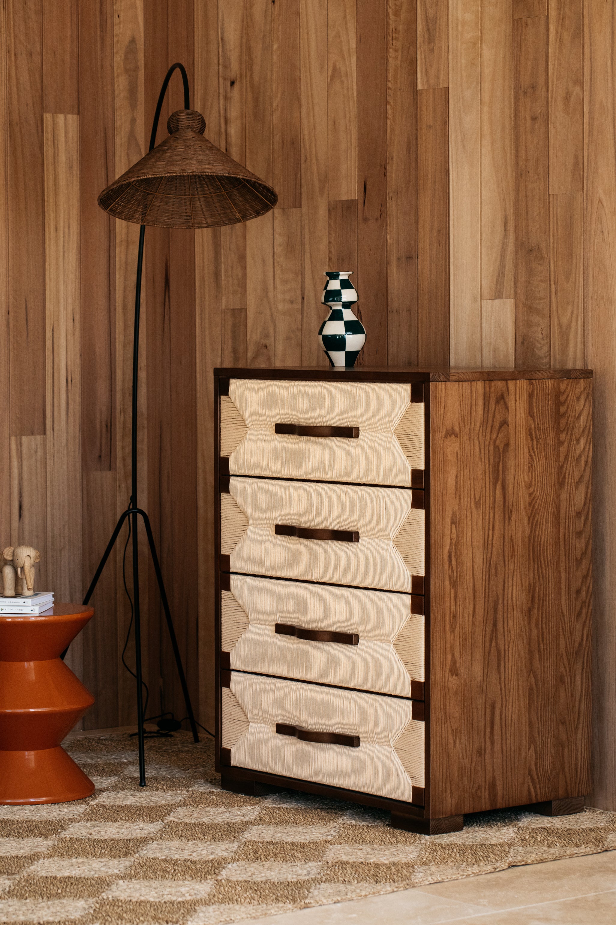 The 4-drawer Myla Ashwood Tallboy Buffet pairs statement style with functional organisation. Made from premium solid Ashwood with a Low VOC deep Walnut finish, this piece offers elegant detailing with a unique design, hand-crafted curved handles, natural-fibre weaving and deep, soft close drawers.