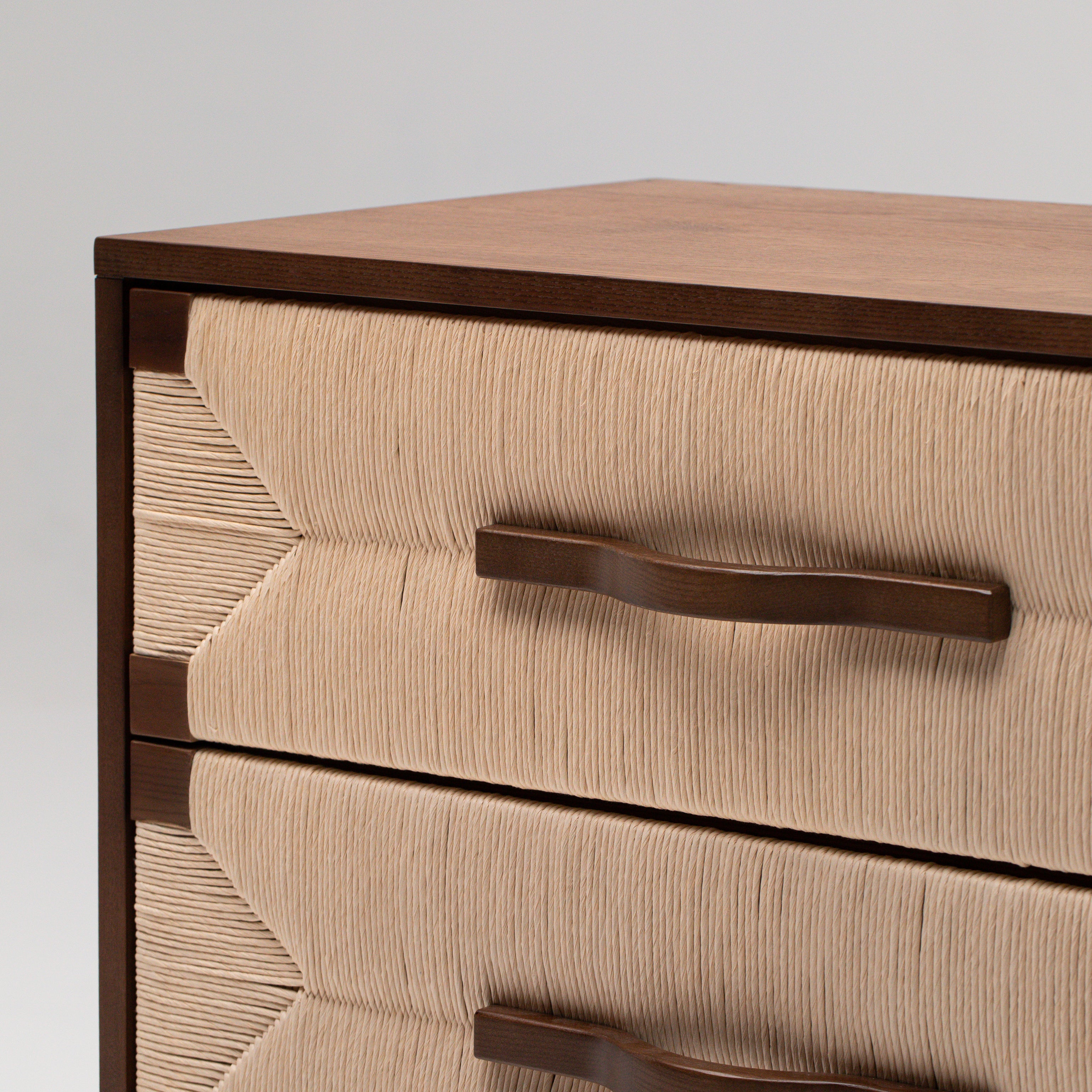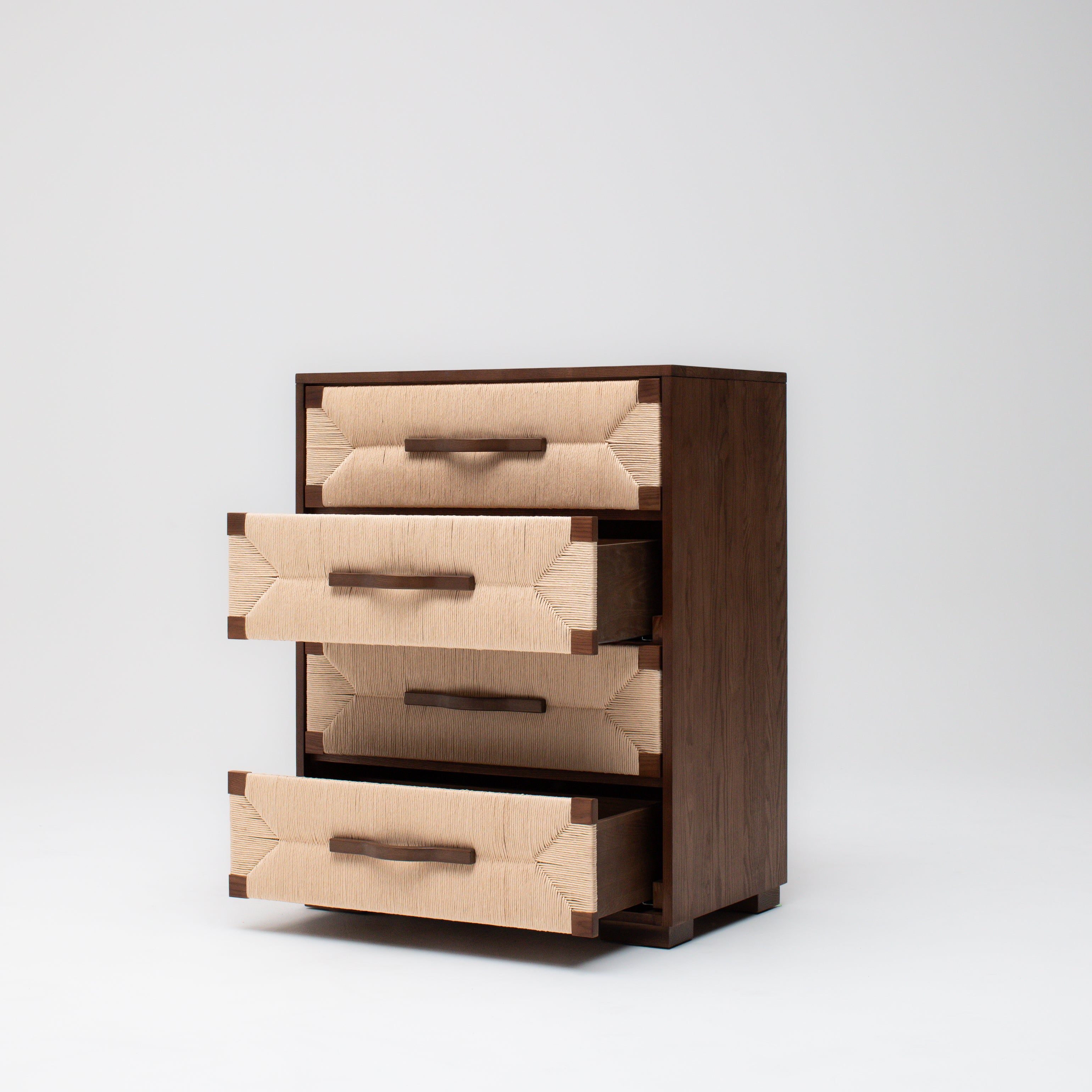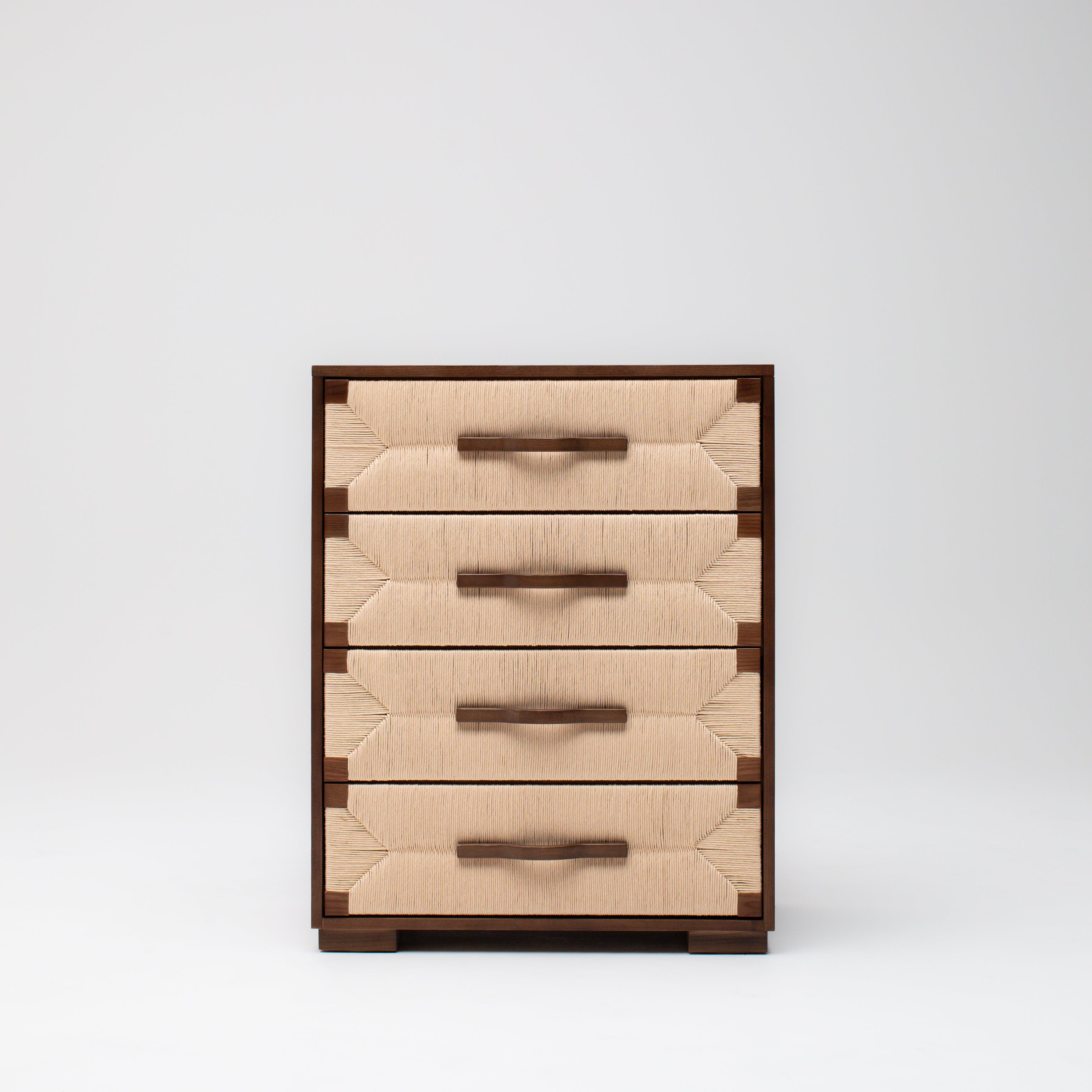 The 4-drawer Myla Ashwood Tallboy Buffet pairs statement style with functional organisation. Made from premium solid Ashwood with a Low VOC deep Walnut finish, this piece offers elegant detailing with a unique design, hand-crafted curved handles, natural-fibre weaving and deep, soft close drawers.