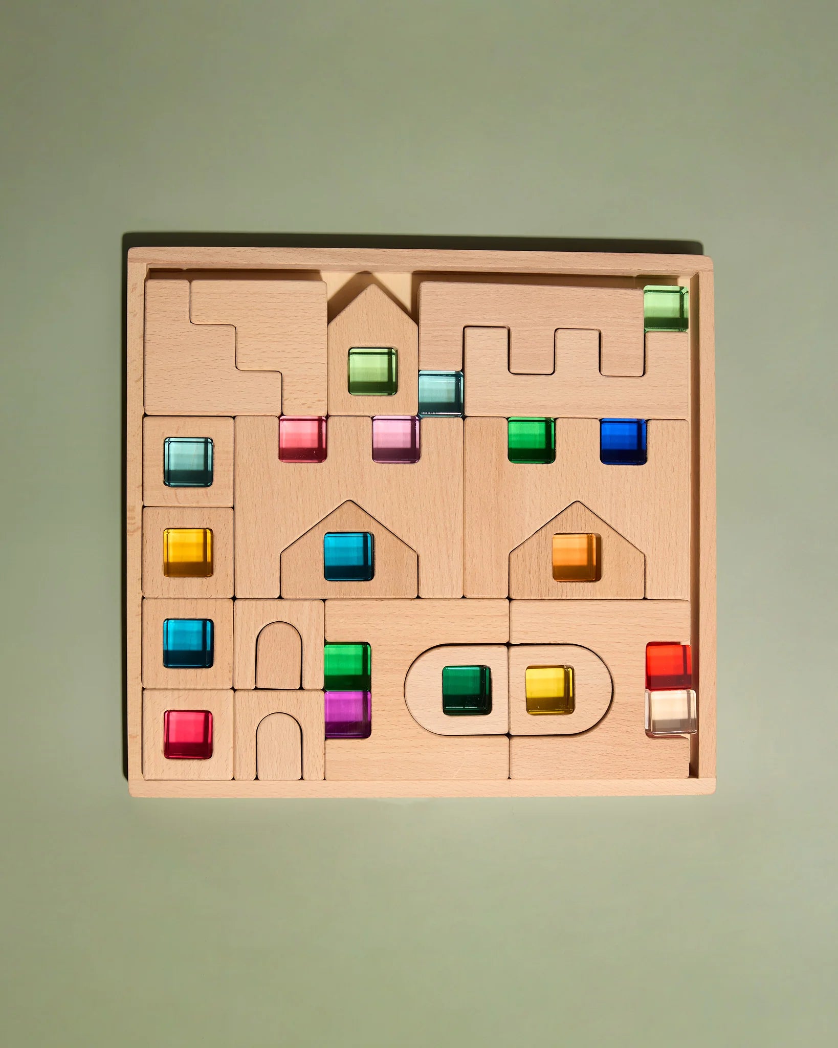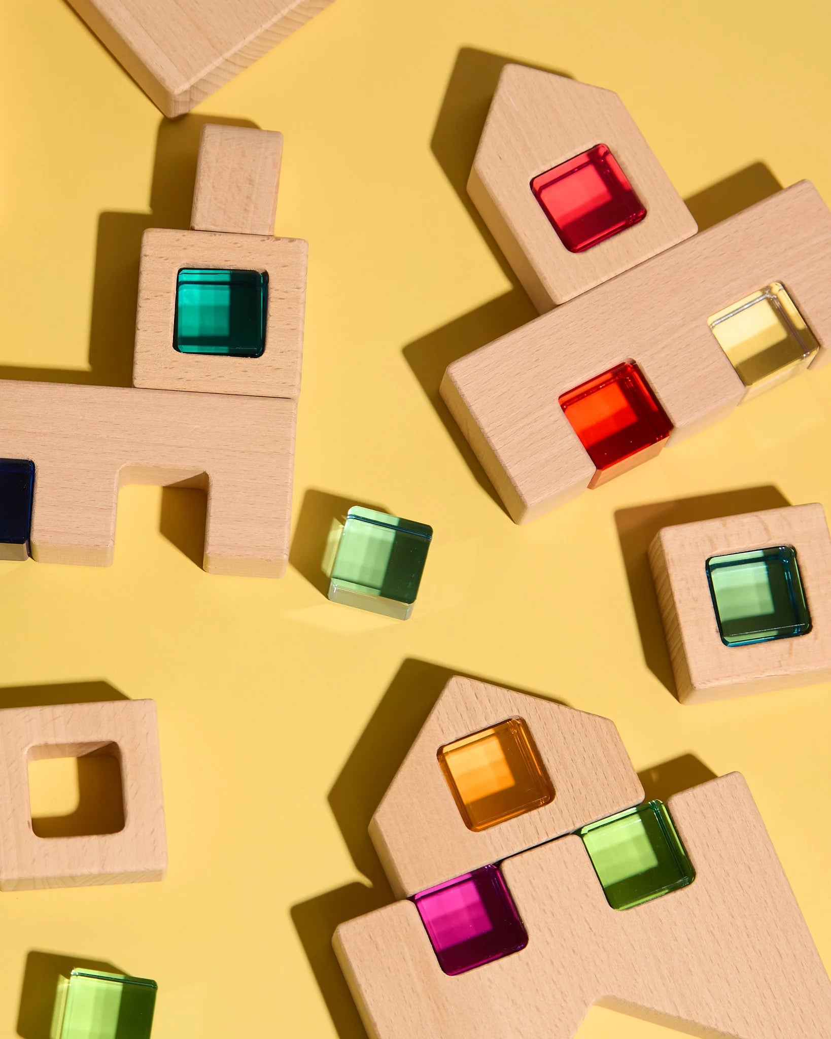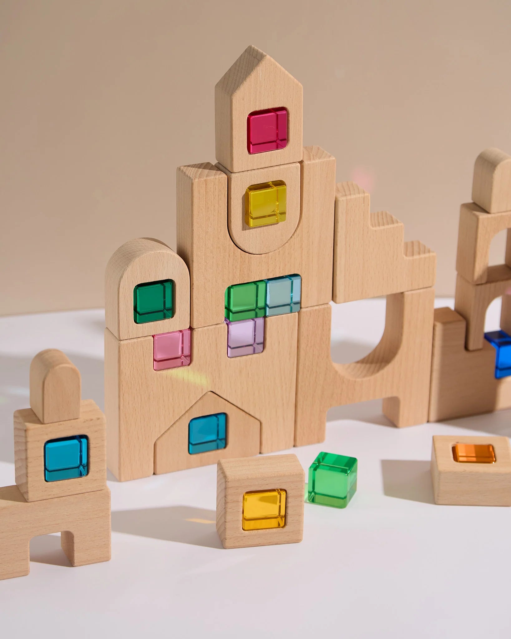 With handcrafted luxe beechwood and jewel-toned Lucite, this set transforms any flat surface into a dreamy build zone.