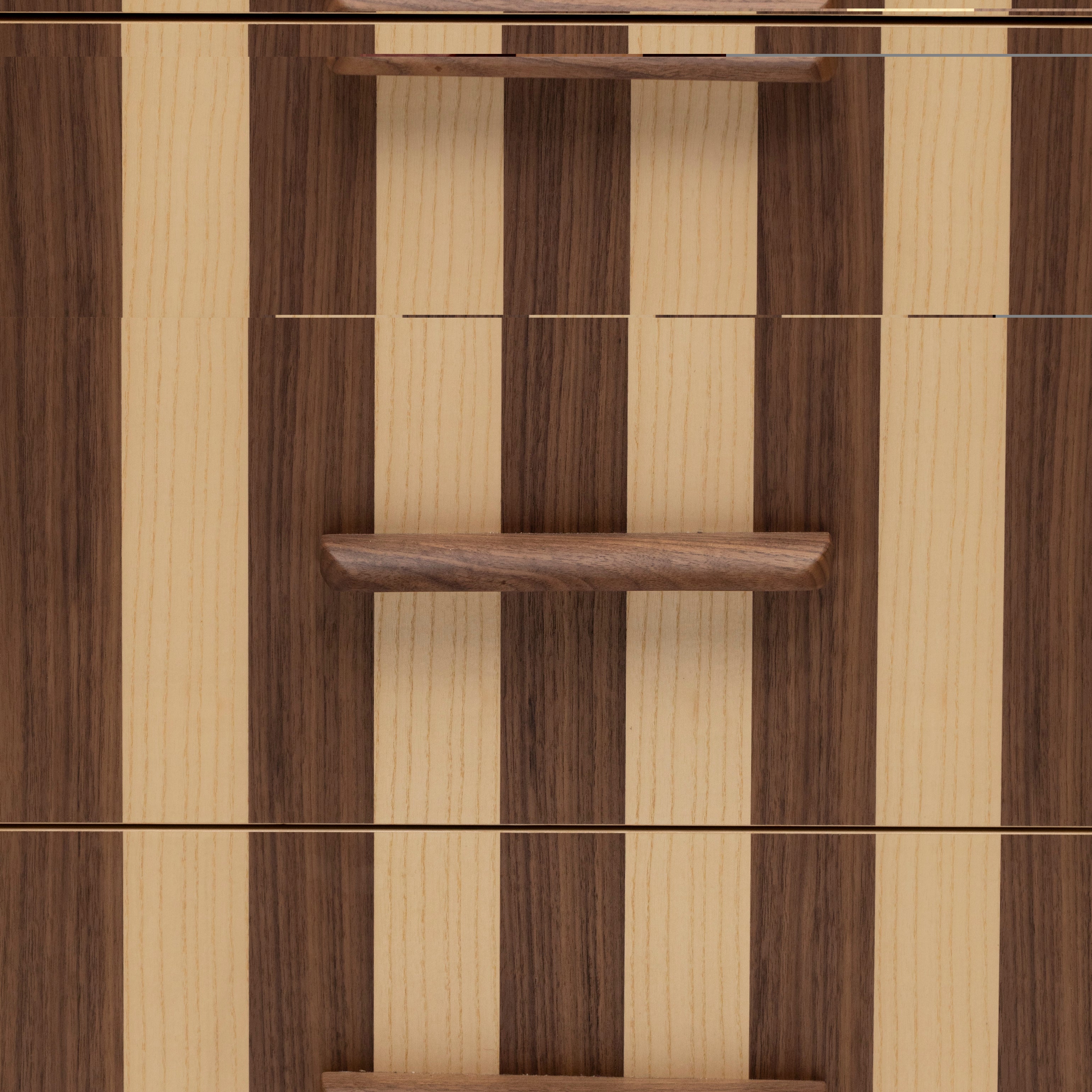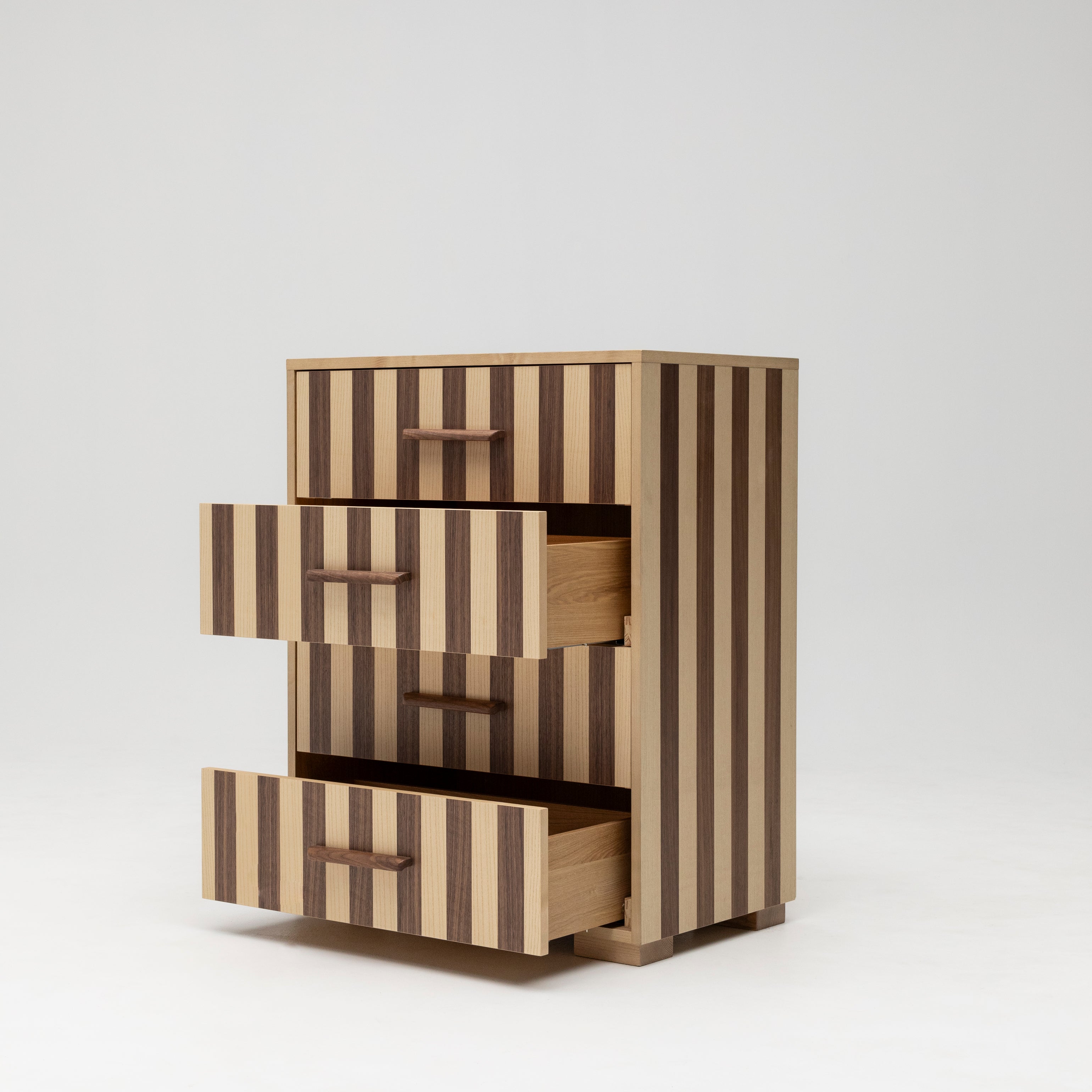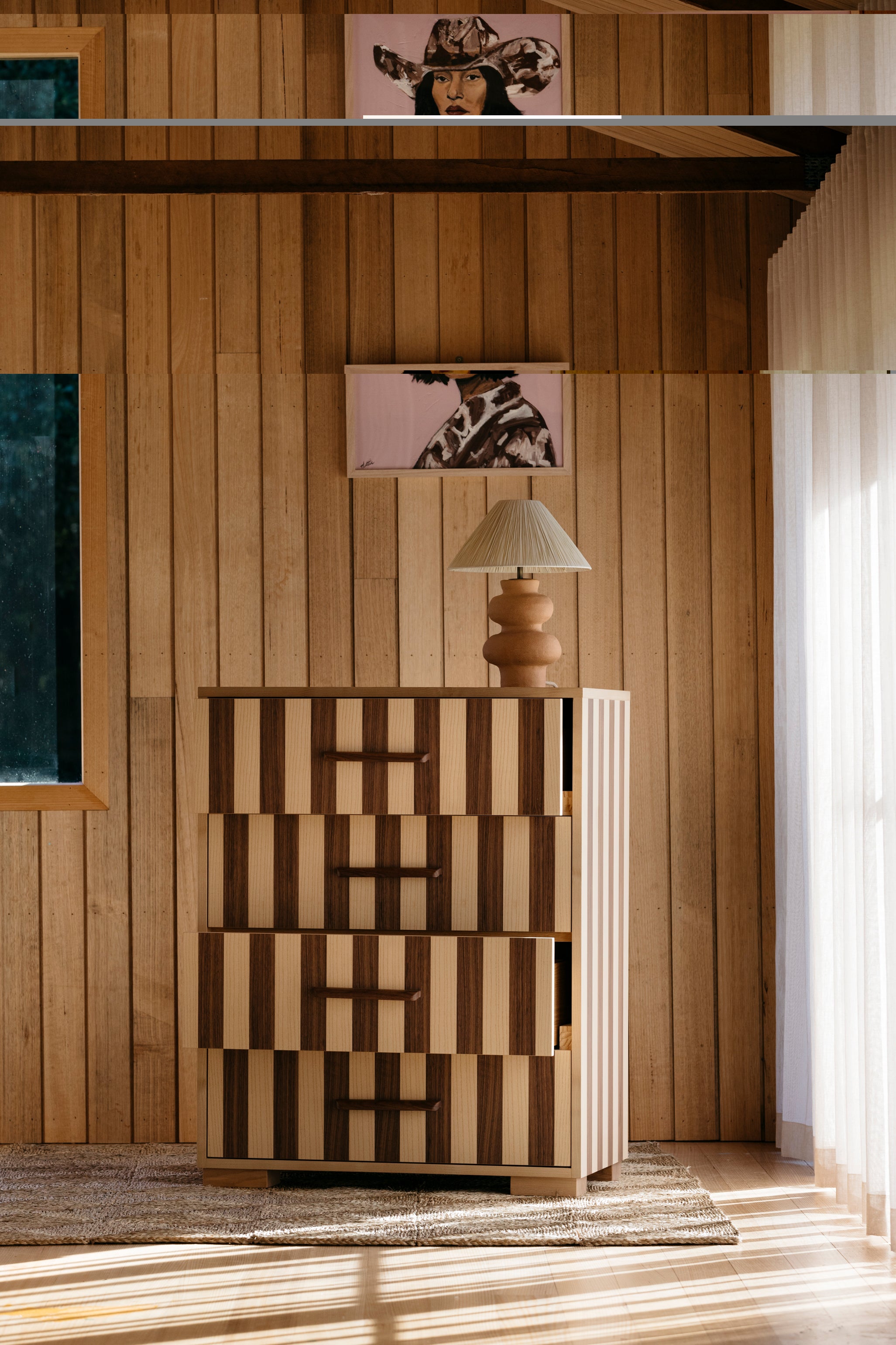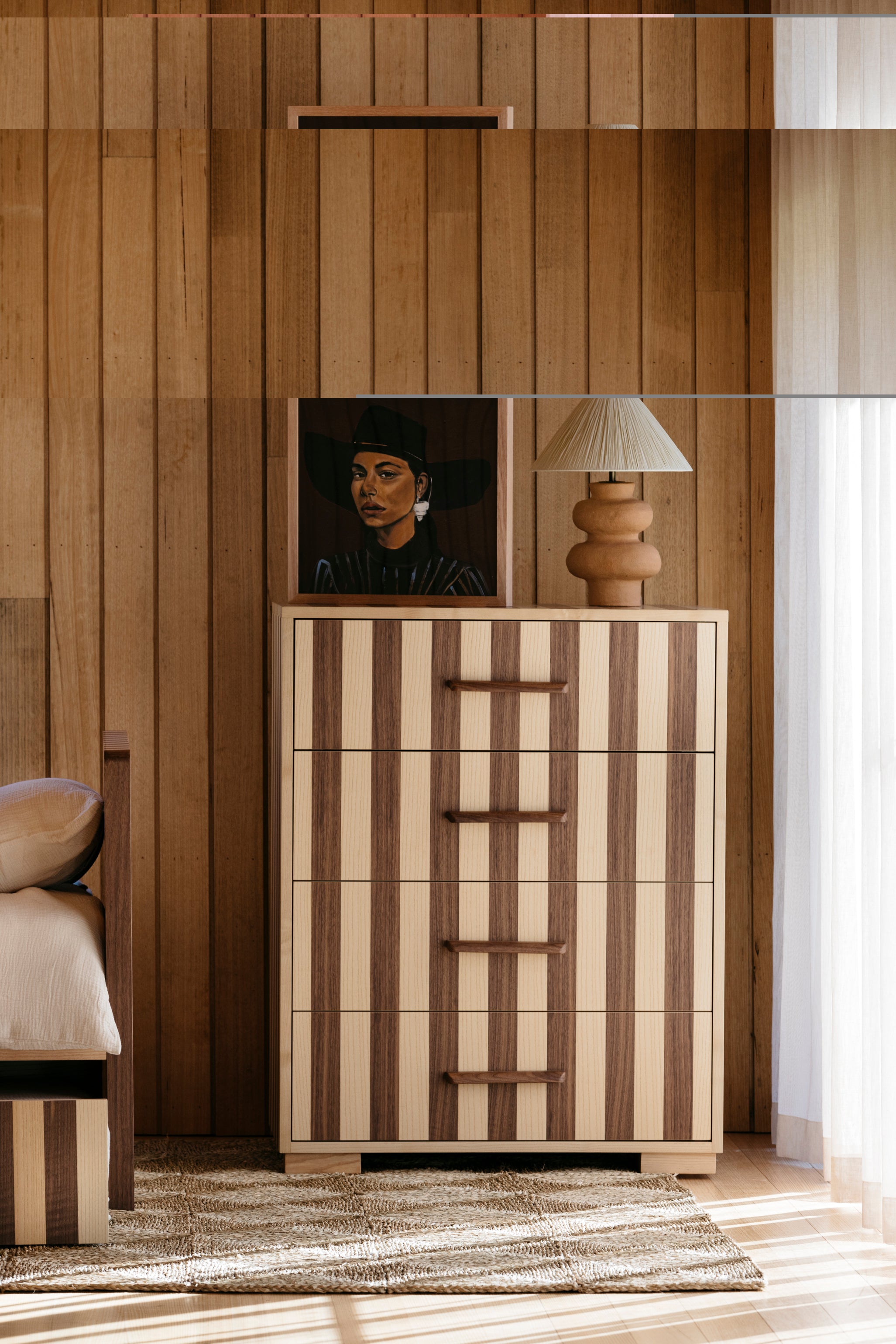 The 4-drawer tallboy brings thoughtful organisation into everyday living. This artisan-crafted piece offers elegant detailing with a stunning two-tone stripe in solid Ashwood alternating with walnut stain.