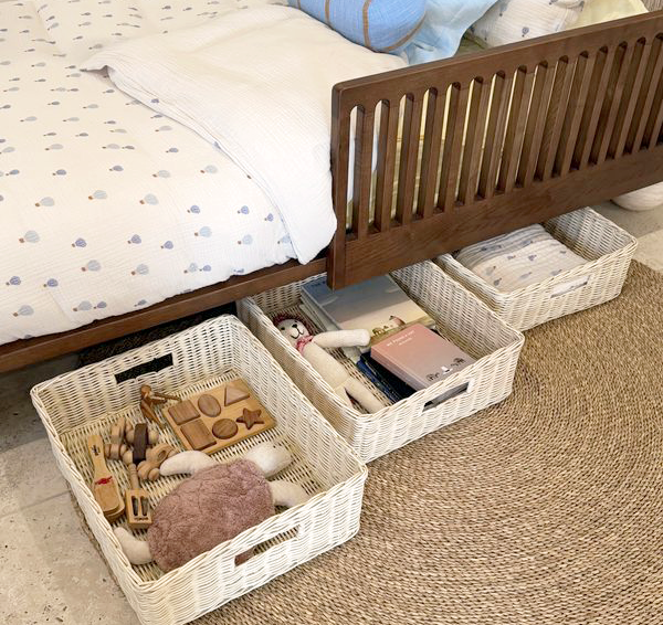Perfectly sized to slide under our low-profile beds, it’s ideal for storing toys, books, spare bedding or night-time comforts, keeping spaces calm, organised and clutter-free. Lightweight yet durable, the basket is easy for children to pull in and out themselves, supporting independence while maintaining a beautifully cohesive room.